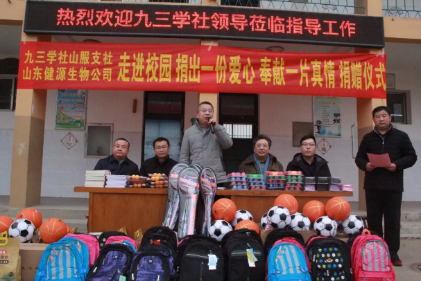 人生之善莫過于助人,助人之德莫過于助學,為積極履行社會責任,關注支持貧困地區教育事業發展,2019年1月11日,九三學社與山東健源生物科技有限公司共同為泰安市高新區化馬灣鄉當地一家小學捐贈了一批體育器材、學習用品及辦公用品,為該校師生送去了社會的關心和溫暖。