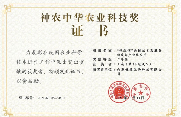 祝賀山東健源生物科技有限公司及王誠董事長參與完成的科研成果:“糧改飼”關鍵技術及裝備研發(fā)與產業(yè)化應用,被中華人民共和國農業(yè)農村部和中國農學會授予2020—2021年度神農中華農業(yè)科技獎科學研究類成果“二等獎”。