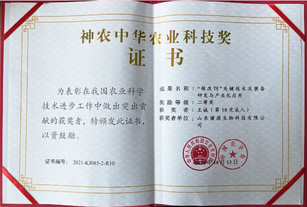 祝賀山東健源生物及王誠董事長榮獲神農中華農業(yè)科技獎科學研究類成果“二等獎”