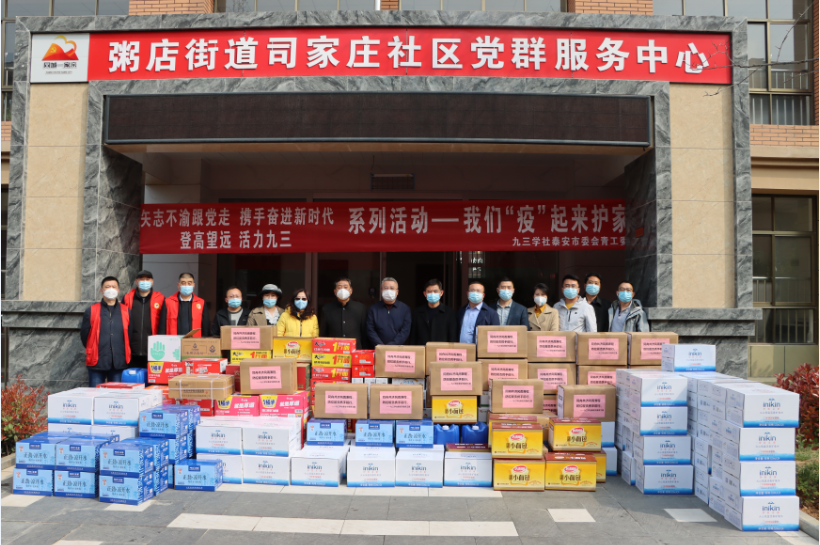 2022年4月2號上午,九三學社泰安市委會青工委集結社員,組織開展了“矢志不渝跟黨走、攜手奮進新時代——我們‘疫’起來護家”愛心捐贈活動,助力疫情防控。社員們先后來到岱岳區天平街道辦事處、粥店辦事處司家莊社區、泰山區省莊鎮東羊樓村等基層地點,看望慰問了在一線工作的防疫人員,并為他們送去醫用口罩48000只、消毒液320斤、75°酒精320斤、方便面110箱、礦泉水285箱、火腿腸、肉丸、面包等若干愛心物資,總價值五萬余元,山東健源生物科技有限公司王誠董事長作為九三學社泰安市直機關基層委員會六支社主委代表公司參與此次愛心捐贈活動。
