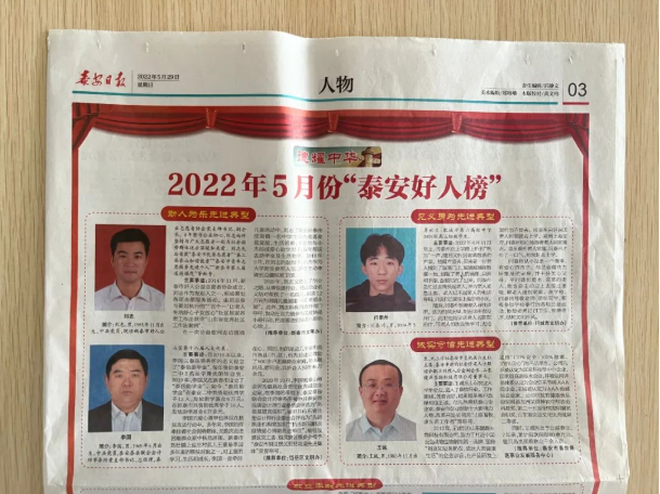 《泰安日報》發(fā)布2022年5月份“泰安好人榜”