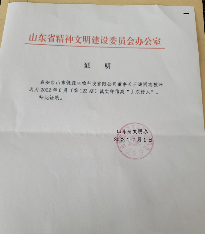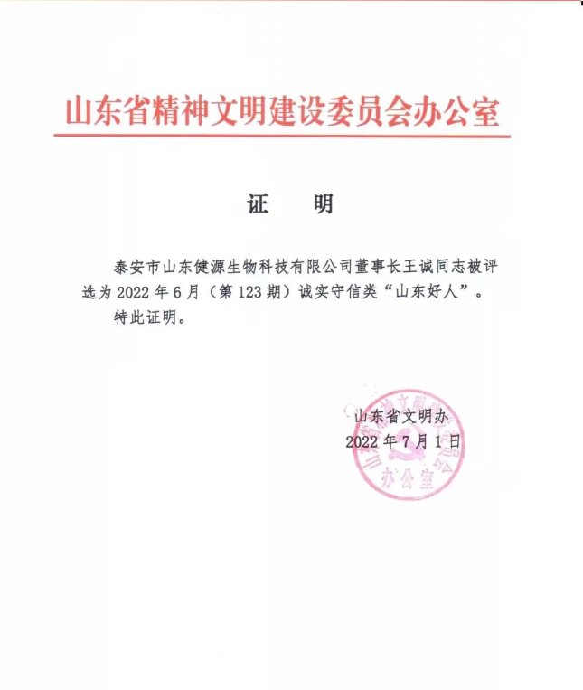 為深入貫徹落實黨的十七屆六中全會精神,推動學雷鋒活動常態(tài)化,推進公民思想道德建設,公民道德素質(zhì)和社會文明程度,努力建設“美德山東”,根據(jù)省委辦公廳《關于深入開展學雷鋒活動的實施意見》(魯辦發(fā)[2012]6號)精神,在全省廣泛開展“山東好人——每周之星”評選活活動由省委宣傳部、省文明辦、大眾報業(yè)集團、省總工會、團省委、省婦聯(lián)、山東廣播電視臺聯(lián)合主辦。山東健源生物科技有限公司王誠董事長被評選為2022年6月(123期)誠實守信類“山東好人”。