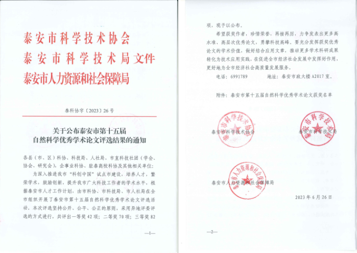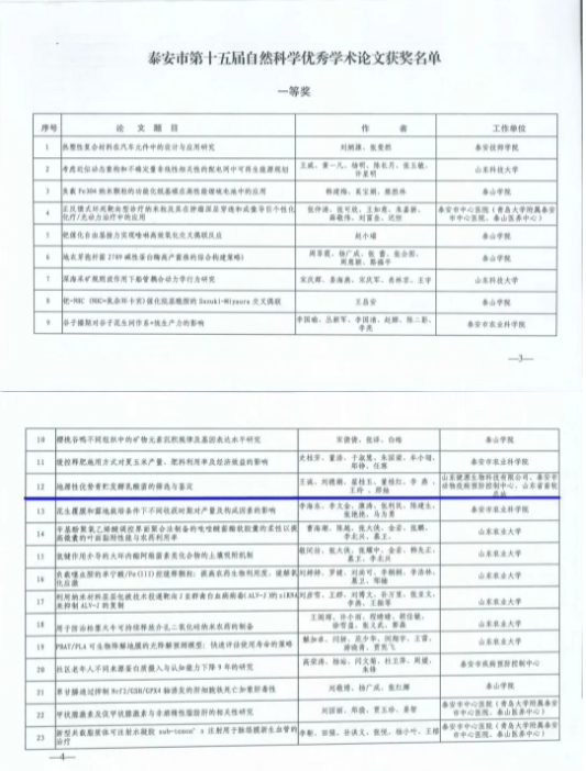 山東健源生物榮獲泰安市第十五屆自然科學優秀學術論文一等獎