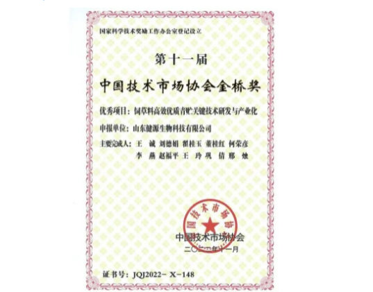 近日, “構(gòu)建新發(fā)展格局,建設(shè)中國式現(xiàn)代化高層報告會暨第十一屆中國技術(shù)市場協(xié)會金橋獎表彰獎勵大會”在北京隆重召開,經(jīng)專家評審委員會評審,山東健源生物科技有限公司《飼草料高效優(yōu)質(zhì)青貯關(guān)鍵技術(shù)研發(fā)與產(chǎn)業(yè)化》項目榮獲第十一屆中國技術(shù)市場協(xié)會金橋獎優(yōu)秀項目獎。