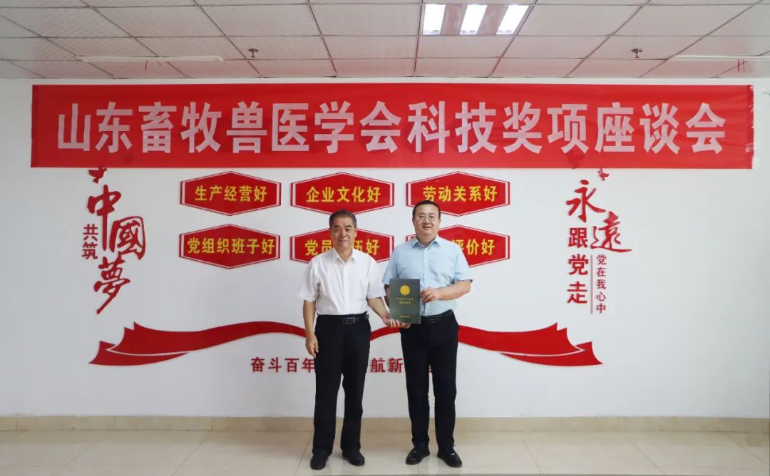 2023年9月9日,泰安市科技局黨組成員、四級調研員李華定,山東畜牧獸醫學會黨支部書記、副理事長兼秘書長崔言順教授,山東畜牧獸醫學會副秘書長、山東農業大學趙孝民教授,山東畜牧獸醫學會副秘書長、山東農業大學張桂國教授,山東農業大學郭翠華教授,山東農業大學中韓交流生嫝珉赫蒞臨公司座談,并為獲獎人員頒發獎勵證書。