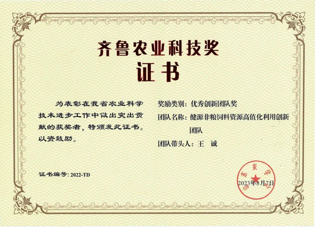 由山東健源生物有限公司董事長王誠作為團隊帶頭人,帶隊的“健源非糧飼料資源高值化利用創新團隊”榮獲2022年度齊魯農業科技獎優秀創新團隊獎。