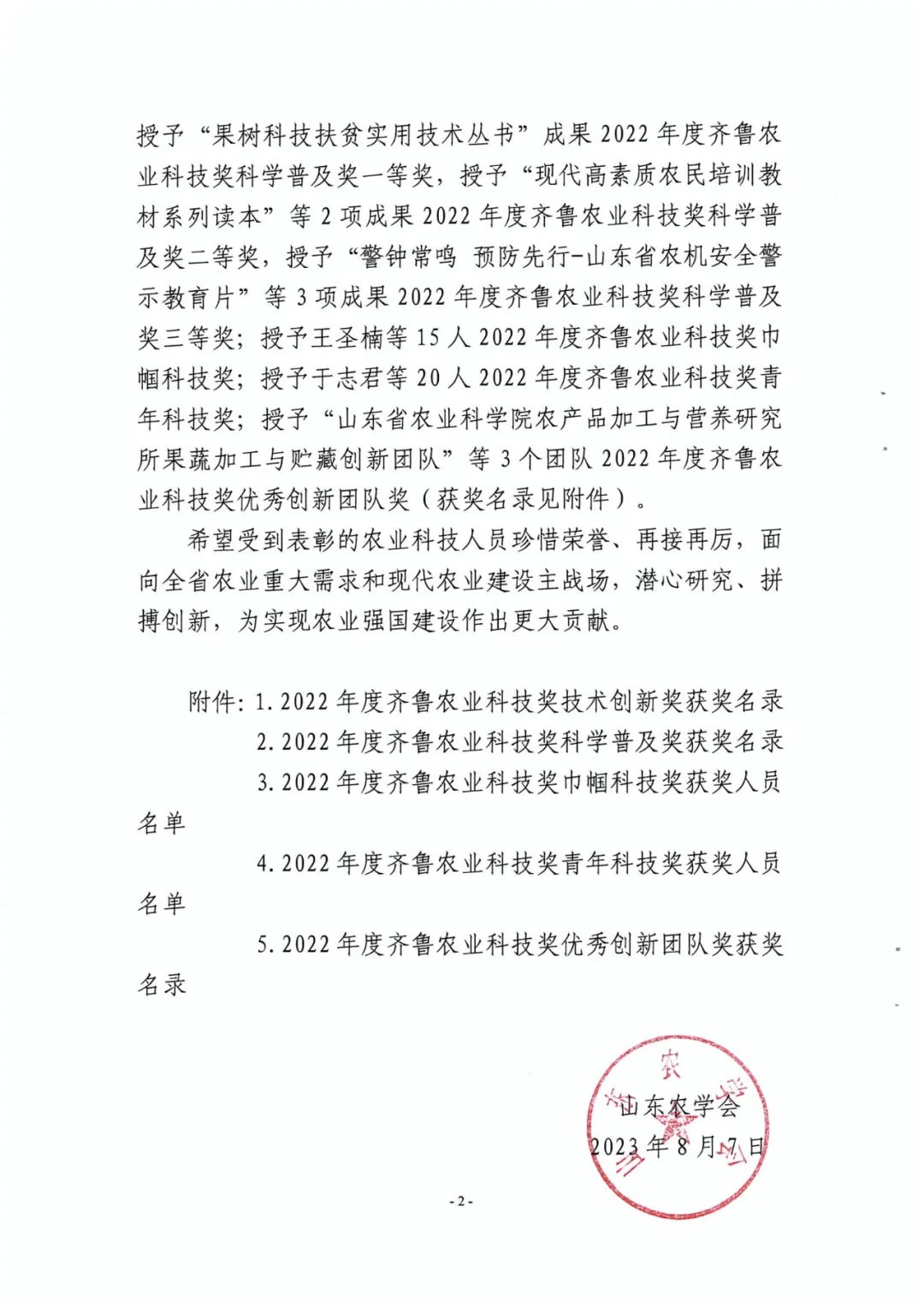 附:關于2022年度齊魯農業科技獎的表彰決定及健源獲獎名錄