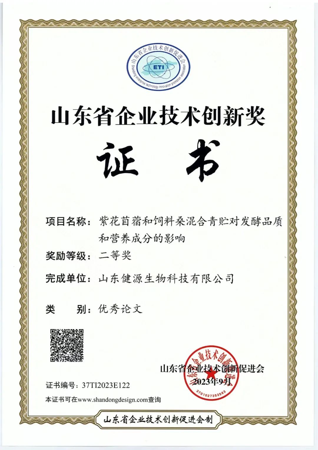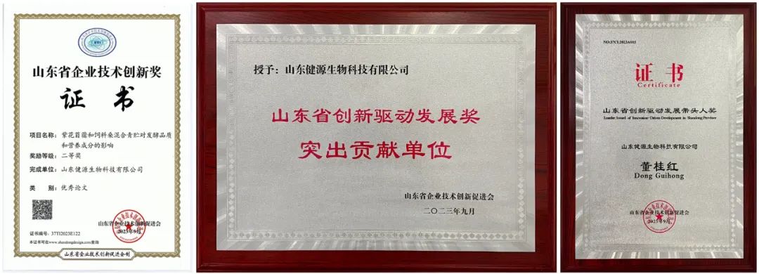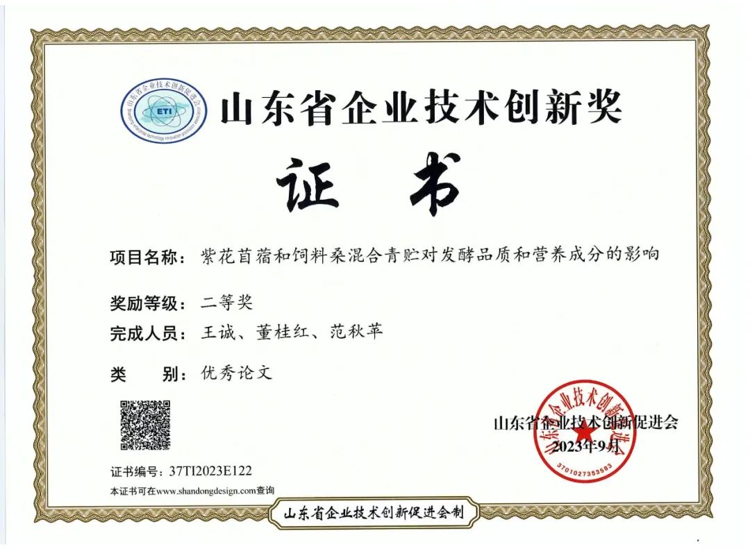 《紫花苜蓿和飼料桑混合青貯對發酵品質和營養成分的影響》榮獲山東省企業技術創新獎優秀論文二等獎