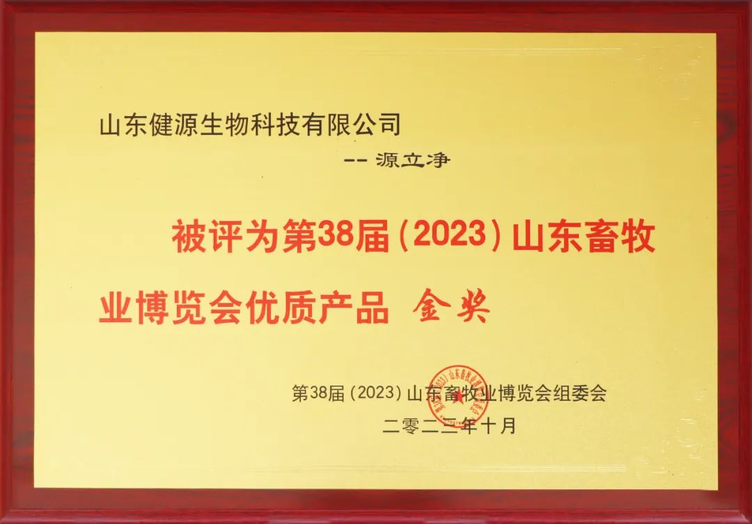 山東健源生物產(chǎn)品“源立凈”獲得第38屆山東畜牧業(yè)博覽會(huì)優(yōu)質(zhì)產(chǎn)品金獎(jiǎng)