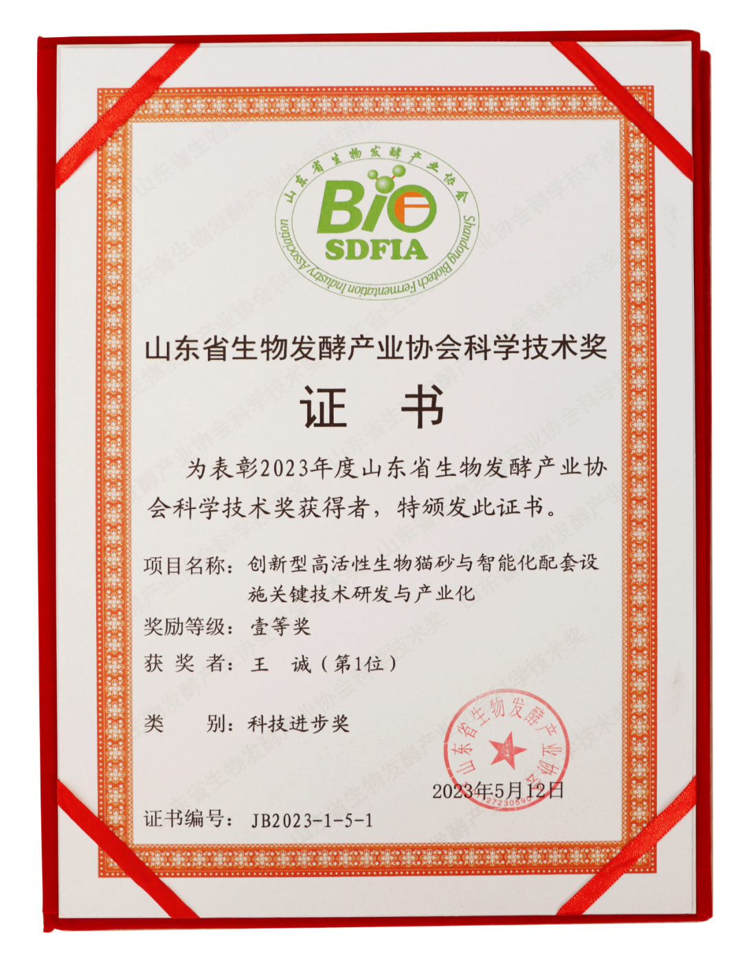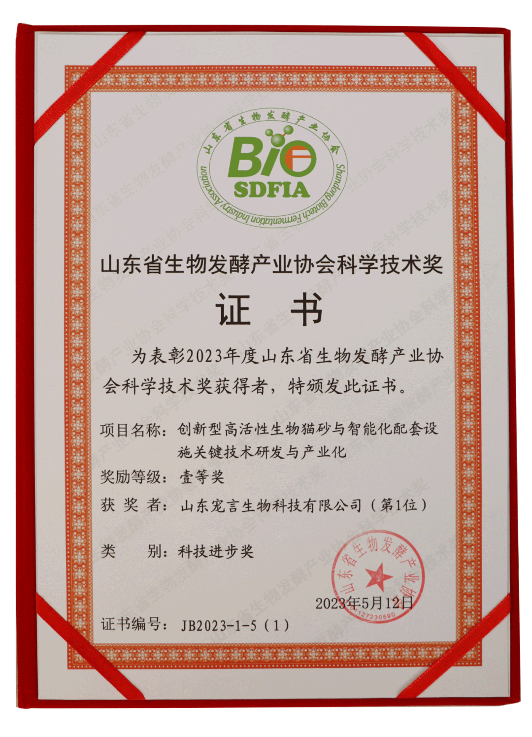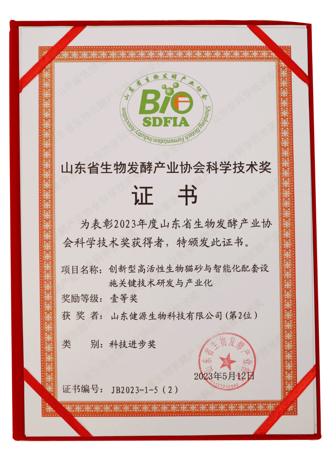 根據(jù)《國務院辦公廳關于完善科技成果評價機制的指導意見》(國辦發(fā)(2021)26號)要求和《山東省科技廳關于進一步鼓勵和規(guī)范山東省社會力量獎設立科學技術獎的指導意見》(魯科字[2018]129號)精神,按照《山東省生物發(fā)酵產業(yè)協(xié)會科學技術獎獎勵章程》相關規(guī)定,山東省生物發(fā)酵產業(yè)協(xié)會開展了2023年度山東省生物發(fā)酵產業(yè)協(xié)會科學技術獎的申報、評審工作,經山東省生物發(fā)酵產業(yè)協(xié)會科學技術獎勵委員會評審和審核,山東省生物發(fā)酵產業(yè)協(xié)會批準,授予1項成果為技術發(fā)明獎特等獎,授予3項成果為科技進步獎特等獎,授予5項成果為科學技術獎一等獎,授予7項成果為科學技術獎二等級。此次授獎項目共計16項。健源生物及其下屬子公司山東寵言生物科技有限公司《創(chuàng)新型高活性生物貓砂與智能化配套設施關鍵技術研發(fā)與產業(yè)化》項目榮獲山東省生物發(fā)酵產業(yè)協(xié)會科學技術獎科技進步獎一等獎。