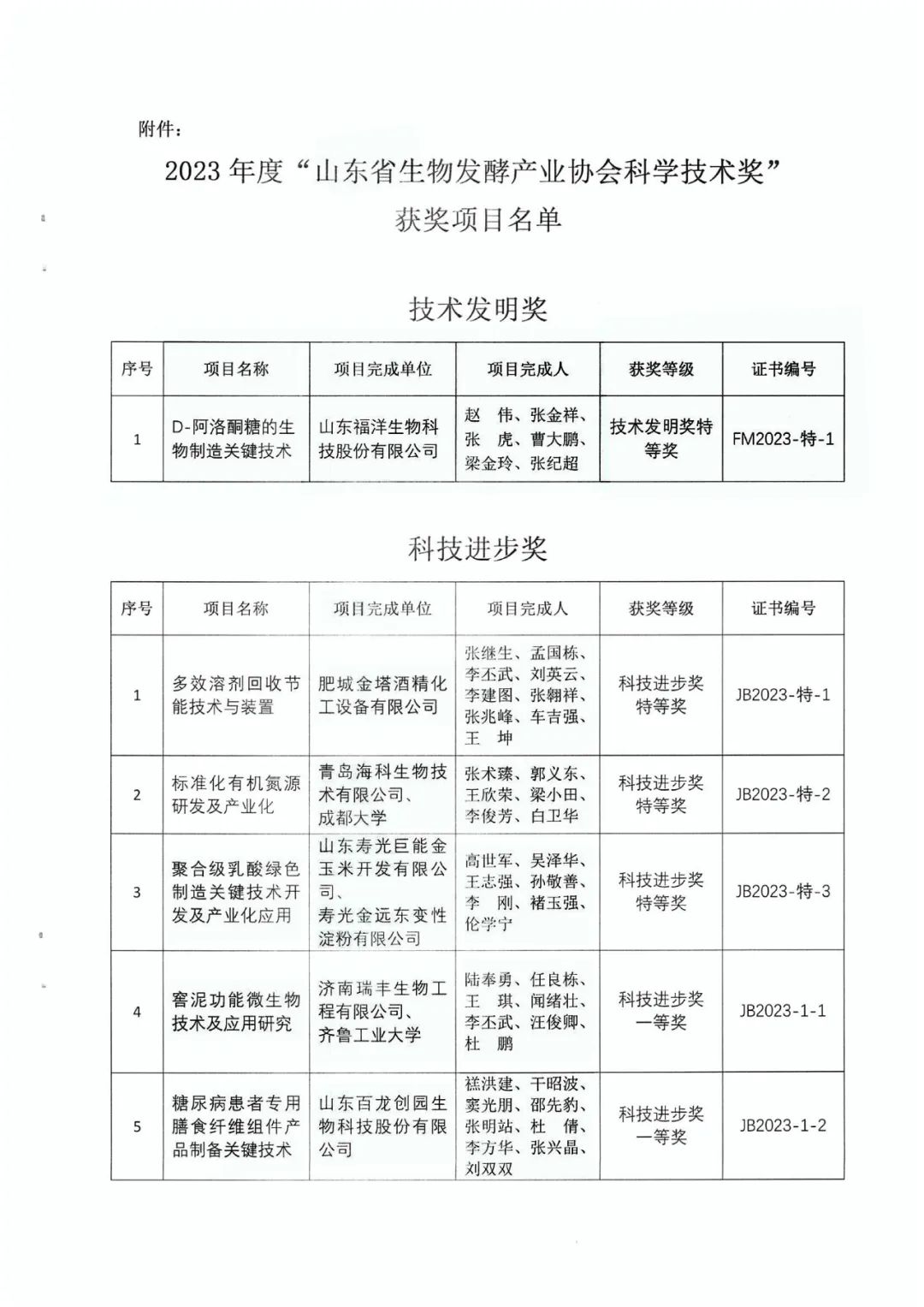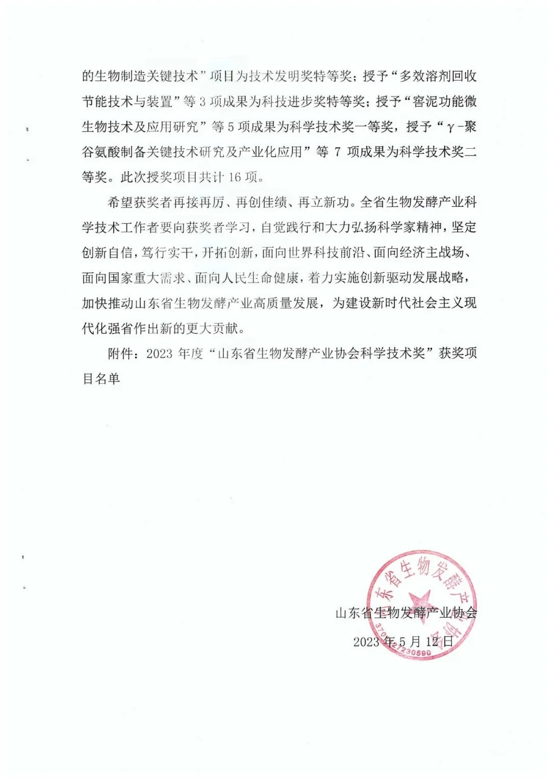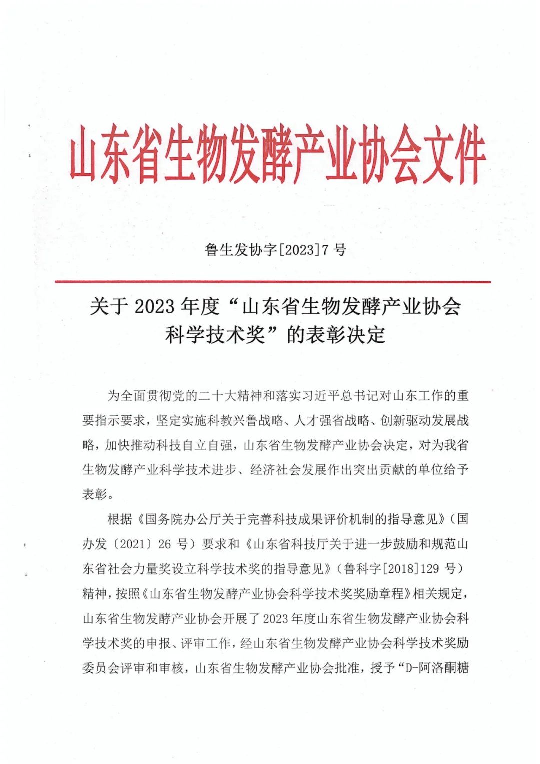 山東省生物發(fā)酵產業(yè)協(xié)會科學技術獎