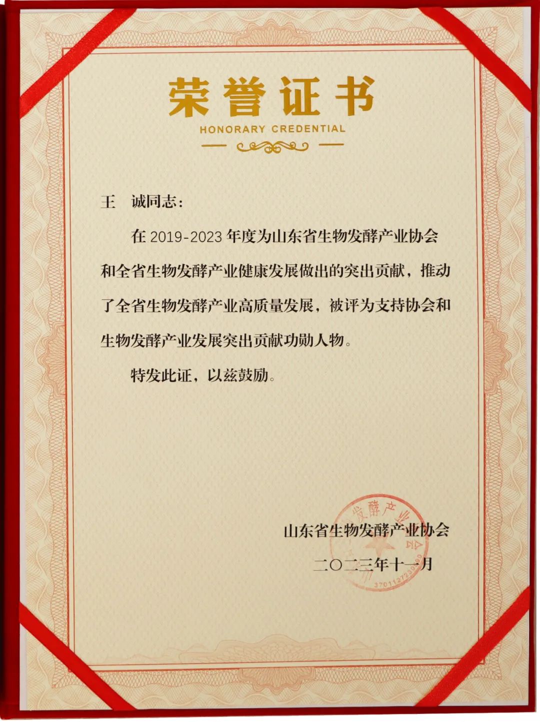 董事長王誠被評為支持協(xié)會和生物發(fā)酵產業(yè)發(fā)展突出貢獻功勛人物