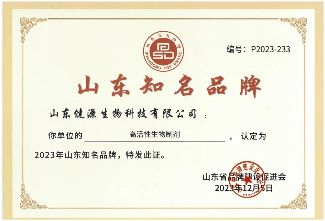 近日,由山東省品牌建設促進會、大眾報業集團、山東廣播電視臺、鳳凰網主辦的“品勢向新 數智賦能”2023年山東品牌年會在濟南成功舉辦。會上,2023年山東知名品牌認定名單重磅發布,山東健源生物科技有限公司健源高活性生物制劑被認定為2023年山東知名品牌。