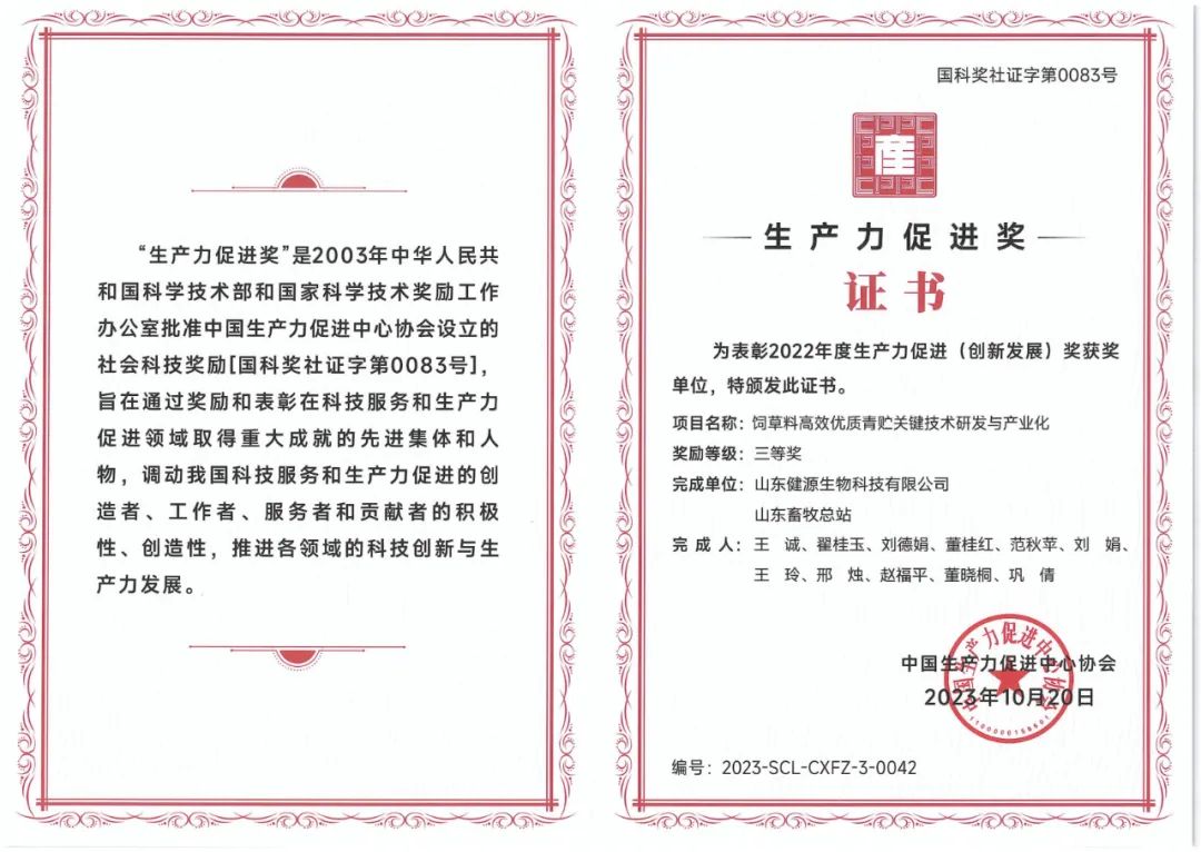 12月9日,2023中國(guó)生產(chǎn)力促進(jìn)中心協(xié)會(huì)年會(huì)暨第十六屆寰宇生產(chǎn)力論壇生產(chǎn)力創(chuàng)新發(fā)展大會(huì)在北京成功召開(kāi),山東健源生物科技有限公司“飼草料高效優(yōu)質(zhì)青貯關(guān)鍵技術(shù)研發(fā)與產(chǎn)業(yè)化”項(xiàng)目榮獲2022年度生產(chǎn)力促進(jìn)(創(chuàng)新發(fā)展)獎(jiǎng)三等獎(jiǎng)。