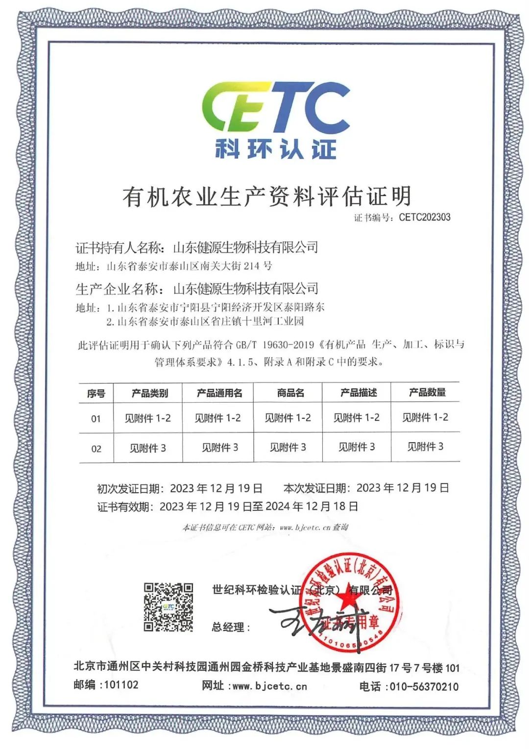 2023年12月,健源生物高活性生物系列產品通過了國內權威第三方認證機構的“有機農業生產資料評估證明”認證。該評估證明用于確認健源生物混合型飼料添加劑、添加劑預混合飼料類產品符合GB/T 19630-2019《有機產品 生產、加工、標識與管理體系要求》4.1.5、附錄A和附錄C中的要求。