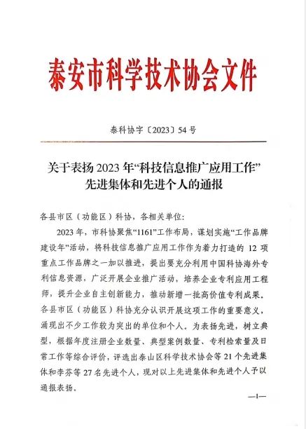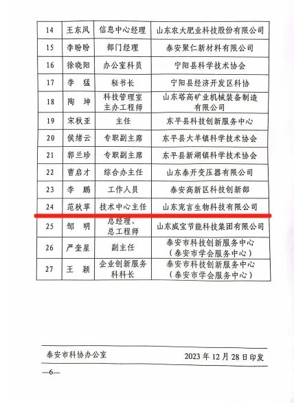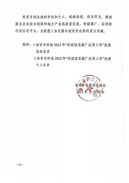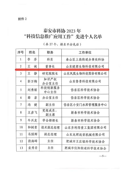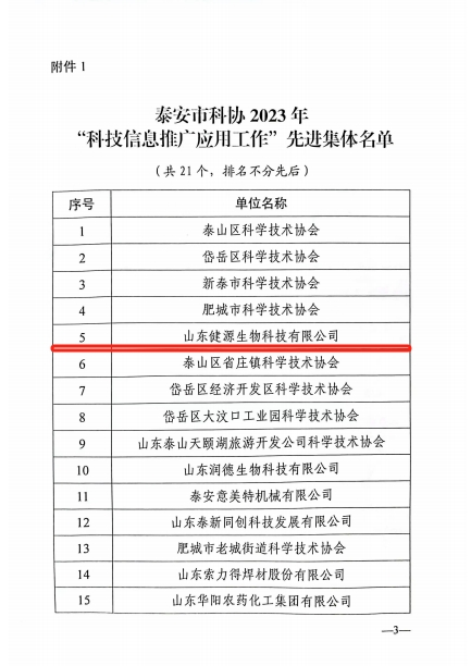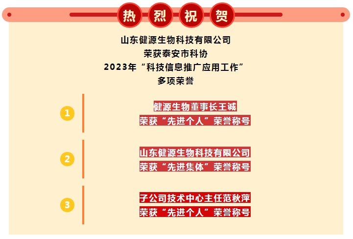 2023年12月28日,泰安市科學技術協會印發《關于表揚2023年“科技信息推廣應用工作”先進集體和先進個人的通報》,山東健源生物科技有限公司董事長王誠被評為泰安市科協2023年“科技信息推廣應用工作”先進個人,山東健源生物科技有限公司被評為泰安市科協2023年“科技信息推廣應用工作”先進集體,旗下子公司寵言生物技術中心主任范秋萍被評為泰安市科協2023年“科技信息推廣應用工作”先進個人。