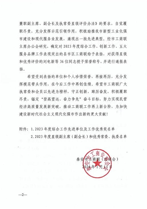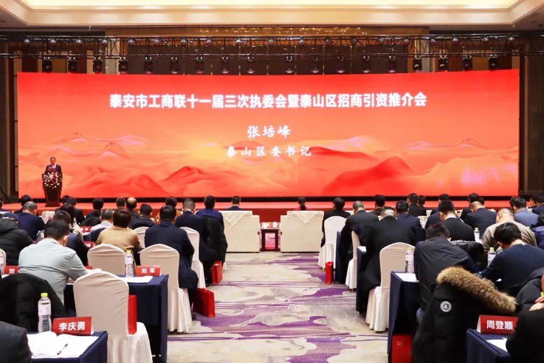 會議期間,舉行泰山區招商引資推介會,泰山區委書記張培峰致辭,泰山區相關負責人作招商推介。會上對2023年度工商聯綜合工作先進單位和單項工作優秀單位,企業家年度星級副主席(副會長)和優秀常委、執委進行了授牌頒獎。山東健源生物科技有限公司董事長王誠被授予“優秀常委”榮譽稱號。