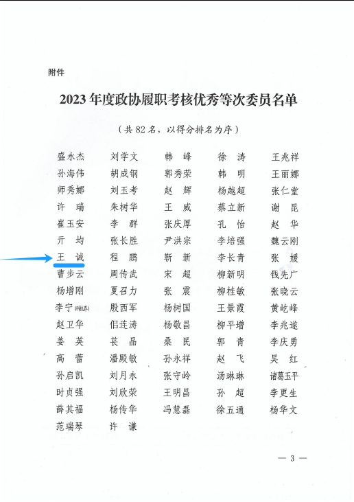 2023年,廣大政協(xié)委員堅(jiān)持以習(xí)近平新時(shí)代中國(guó)特色社會(huì)主義思想為指導(dǎo),全面貫徹黨的二十大精神,圍繞中心、服務(wù)大局、高標(biāo)準(zhǔn)履職、高效率作為,為全面開創(chuàng)新時(shí)代社會(huì)主義現(xiàn)代化強(qiáng)市建設(shè)新局面貢獻(xiàn)了智慧和力量。為表?yè)P(yáng)先進(jìn),會(huì)上公布了2023年度政協(xié)履職考核優(yōu)秀等次委員名單,董事長(zhǎng)王誠(chéng)光榮上榜!