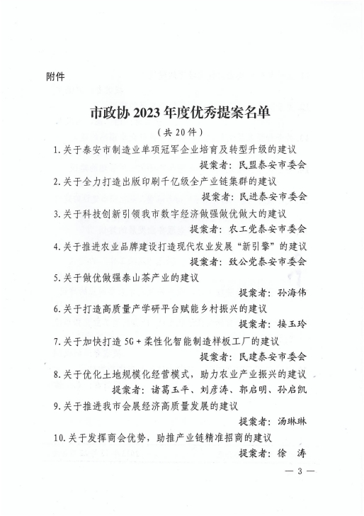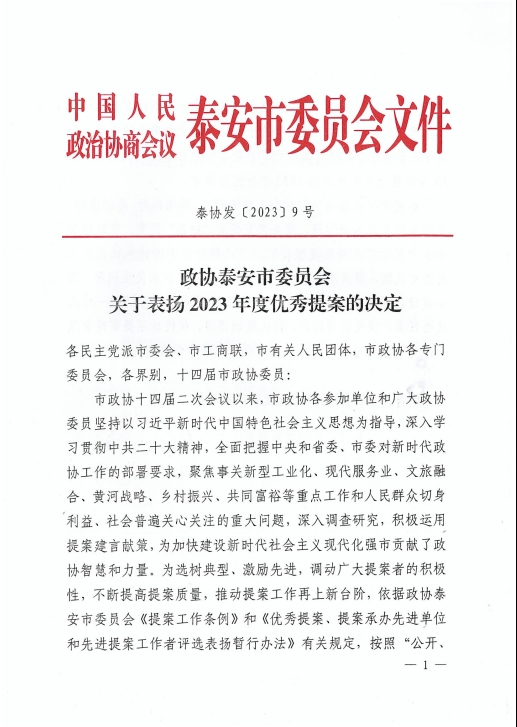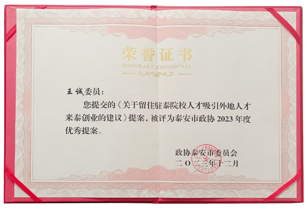 在會(huì)上,政協(xié)泰安市委員會(huì)發(fā)布了關(guān)于表?yè)P(yáng)2023年度優(yōu)秀提案的決定,王誠(chéng)董事長(zhǎng)《關(guān)于留住駐泰院校人才,吸引外地人才來(lái)泰創(chuàng)業(yè)的建議》被選為優(yōu)秀提案。