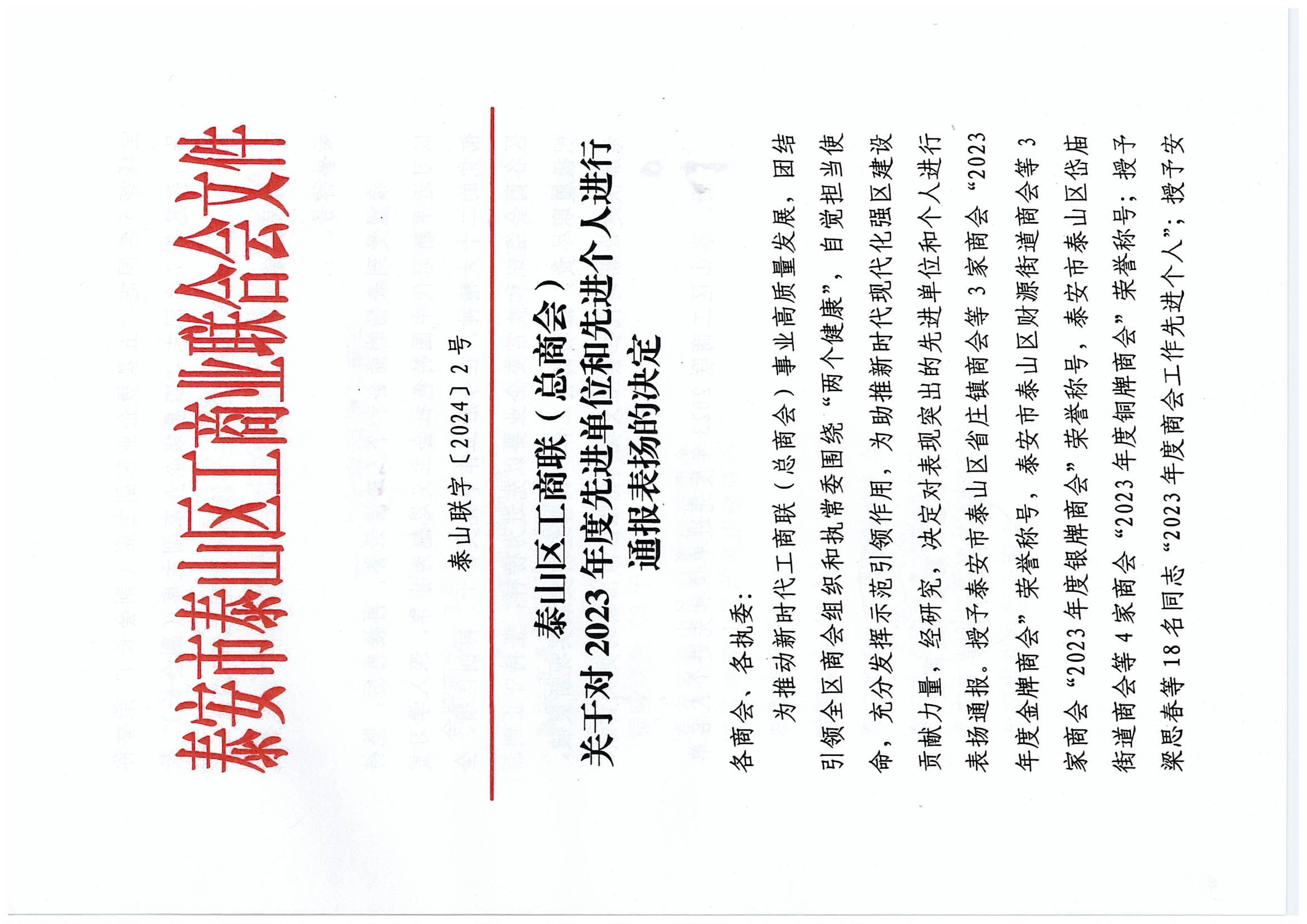 董事長王誠榮獲泰山區工商聯“2023年度優秀執(常)委”榮譽稱號