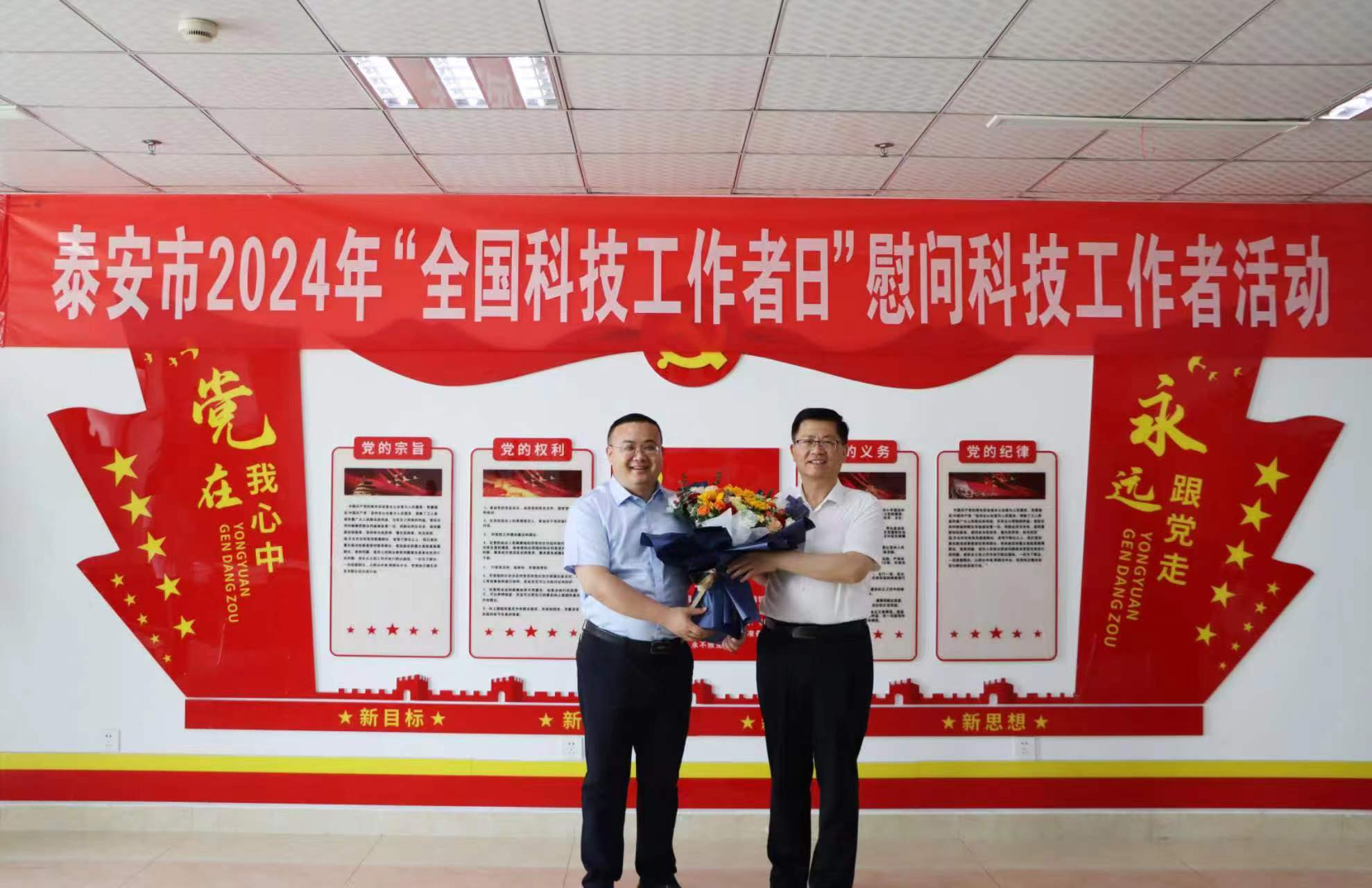 5月24日上午,泰安市科協黨組成員、副主席范寶品帶隊到山東健源生物科技有限公司慰問2023年度“齊魯最美工程師”獲得者王誠董事長,贈送鮮花,并致以節日的問候和祝福。