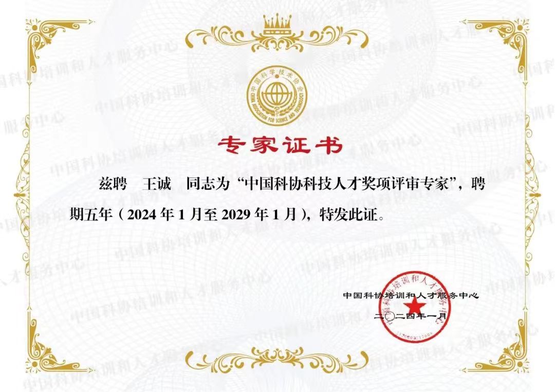 2024年1月被聘請為“中國科協科技人才獎項評審專家”