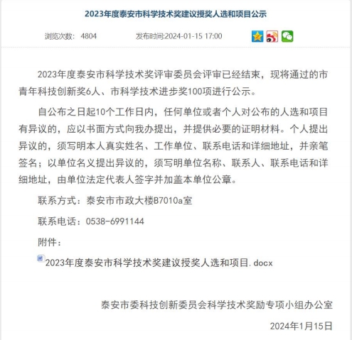 作為項目第一完成人榮獲泰安市科學技術進步一等獎