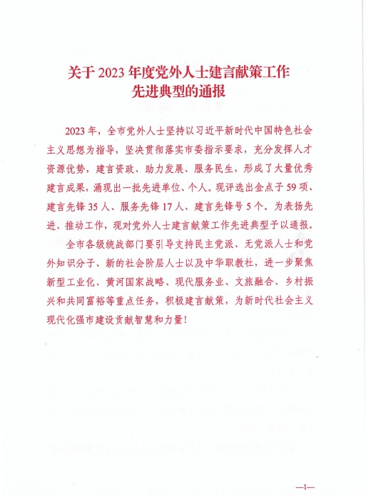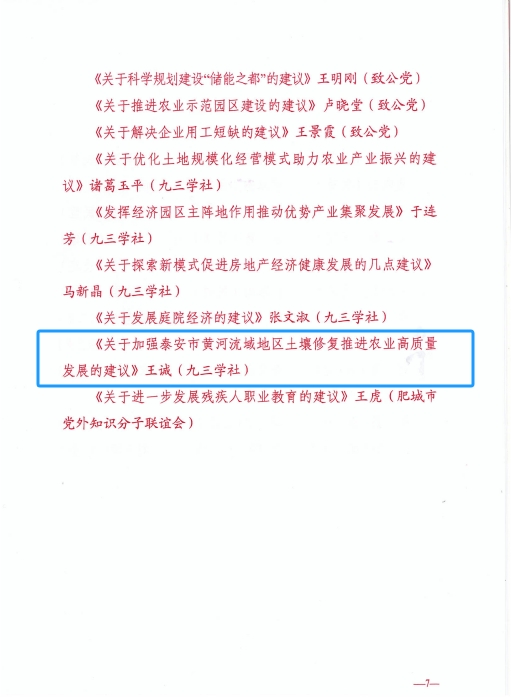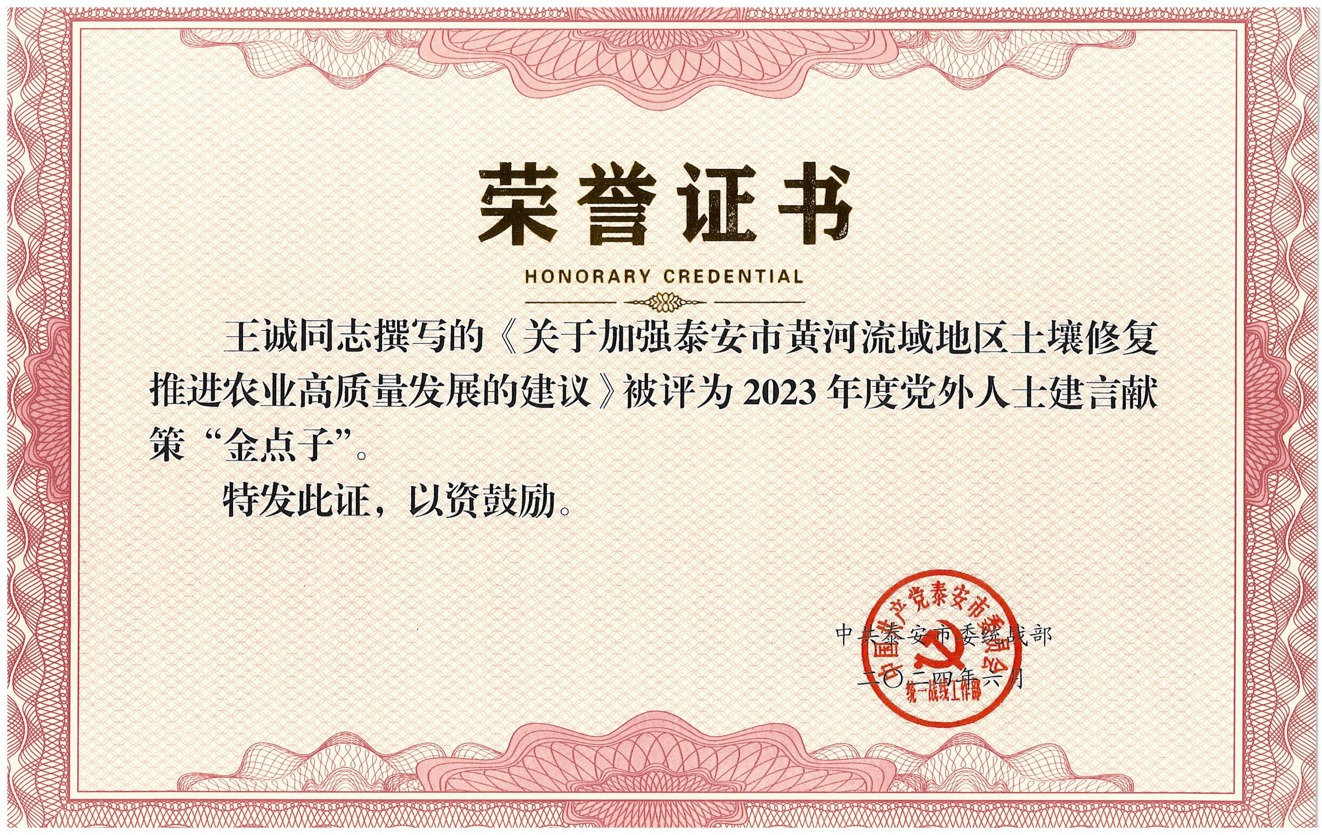 發(fā)布時間:[2024-7-9 17:52:5] 瀏覽量:3320次會上公布了《關(guān)于2023年度黨外人士建言獻(xiàn)策工作先進(jìn)典型的通報》,王誠董事長被評為2023年度黨外人士建言獻(xiàn)策“建言先鋒”,撰寫的《關(guān)于加強(qiáng)泰安市黃河流域地區(qū)土壤修復(fù)推進(jìn)農(nóng)業(yè)高質(zhì)量發(fā)展的建議》被評為2023年度黨外人士建言獻(xiàn)策“金點子”。