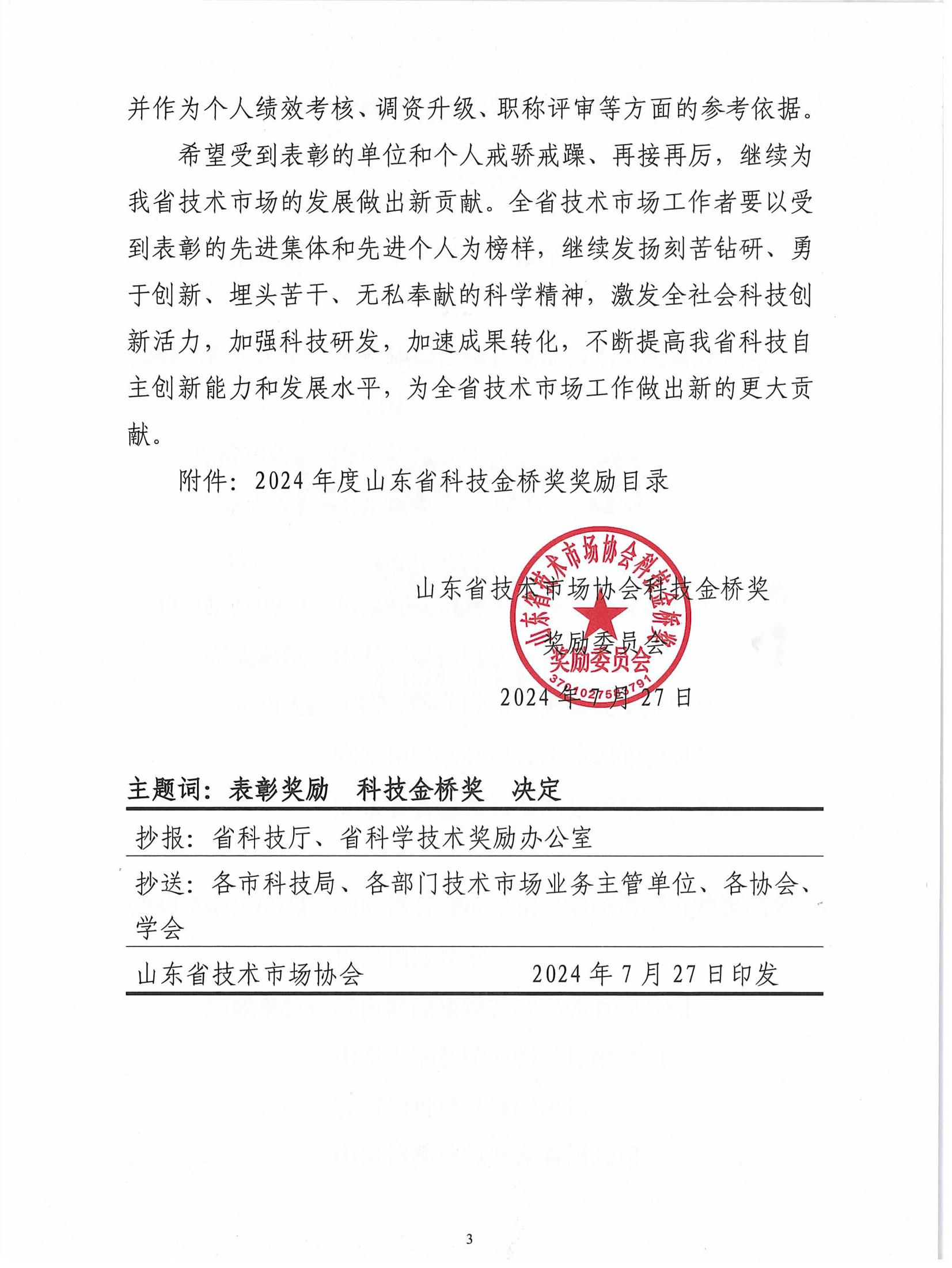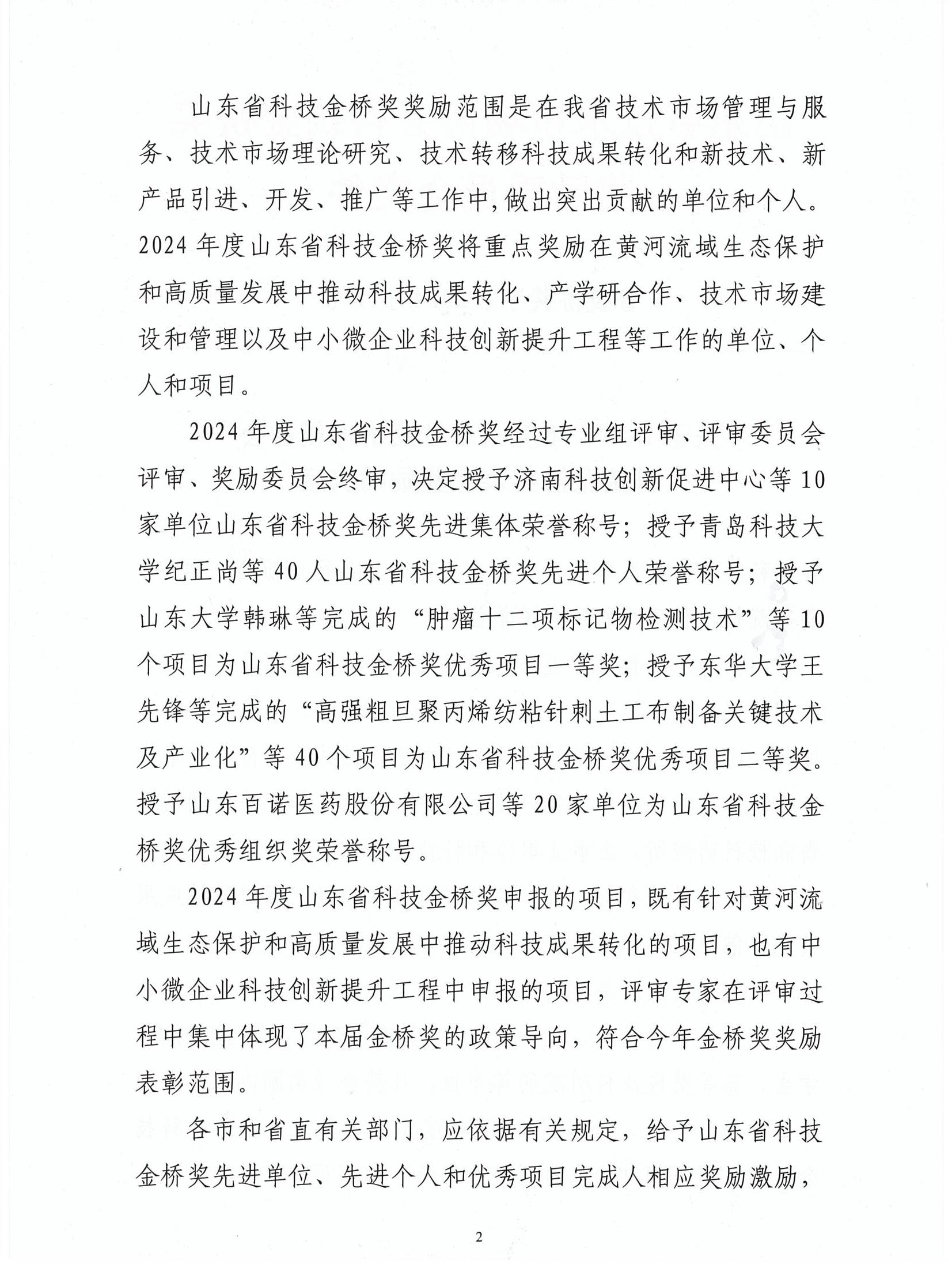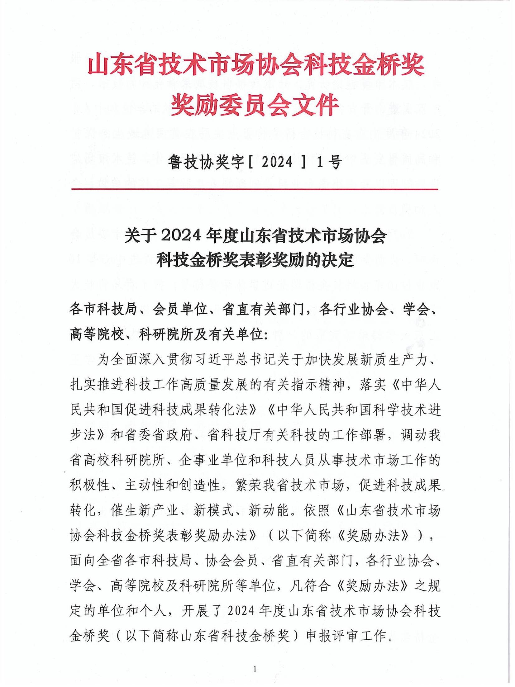 科技金橋獎是山東省科技廳備案的省內技術市場領域最高獎項,本屆金橋獎重點獎勵在黃河流域生態保護和發展新質生產力中推動科技成果轉化、產學研合作以及為我省科技大市場建設中做出突出貢獻等工作的單位、個人和項目,共評出50個優秀項目,其中一等獎10個。