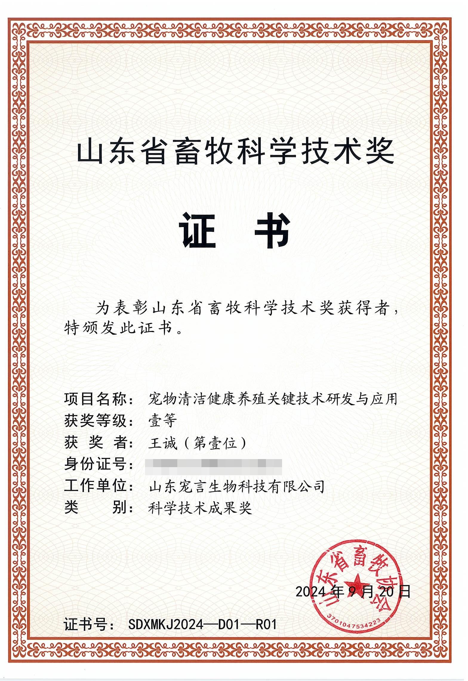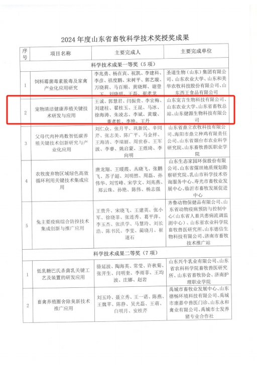 近日,山東省畜牧協會公布了2024年山東省畜牧科學技術獎獲獎名單。山東健源生物科技有限公司與子公司山東寵言生物科技有限公司共同完成的“寵物清潔健康養殖關鍵技術研發與應用”項目,憑借其創新性與實用性,榮獲山東省畜牧科學技術獎科學技術成果獎一等獎。
