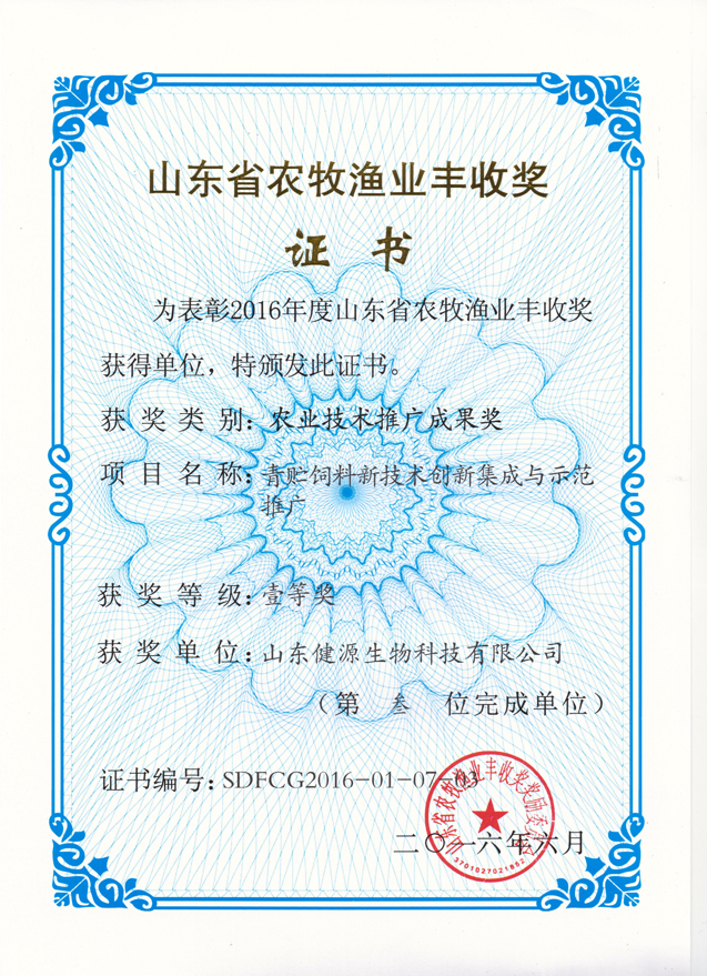 2017-1-10 健源生物榮獲“山東省農(nóng)牧漁業(yè)豐收獎–壹等獎”殊榮