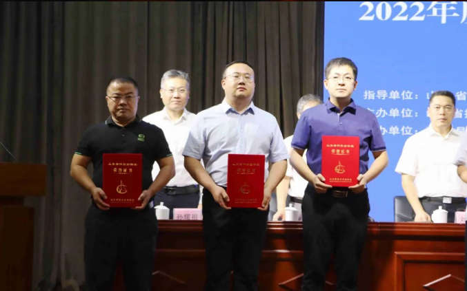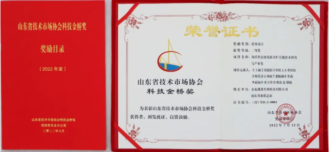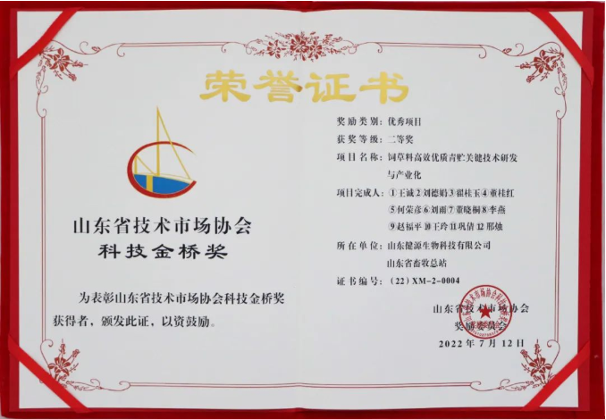 2022年8月11日,2022年度山東省科技金橋獎表彰獎勵大會暨泰山科技論壇在淄博高青舉行。會議現場為項目頒獎,經過專業組評審、評審委員會評審、獎勵委員會終審,決定授予山東健源生物科技有限公司項目為山東省科技金橋獎項目二等獎,山東健源生物王誠董事長作為項目完成人上臺領獎。