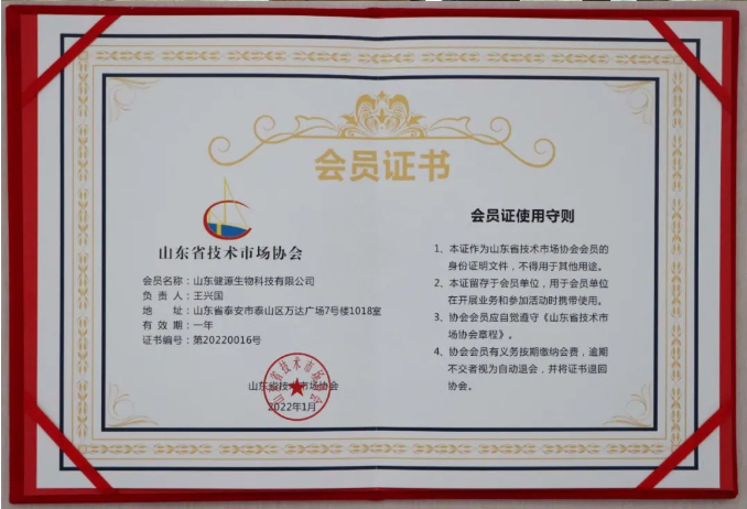 山東健源生物科技有限公司成為山東省技術市場協會會員單位