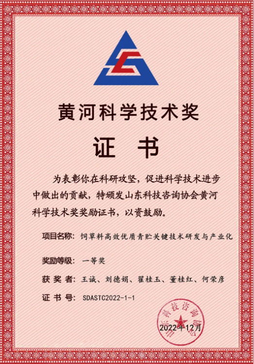 2022年12月山東科技咨詢協(xié)會(huì)公布了2022年黃河科學(xué)技術(shù)獎(jiǎng)評(píng)審結(jié)果的公告,經(jīng)專家評(píng)審會(huì)評(píng)審,現(xiàn)批準(zhǔn)28個(gè)項(xiàng)目獲2022年山東科技咨詢協(xié)會(huì)黃河科學(xué)技術(shù)獎(jiǎng),其中一等獎(jiǎng)3人,二等獎(jiǎng)5人,三等獎(jiǎng)20人。山東健源生物科技有限公司申報(bào)的《飼草料高效優(yōu)質(zhì)青貯關(guān)鍵技術(shù)研發(fā)與產(chǎn)業(yè)化》項(xiàng)目榮獲一等獎(jiǎng)。