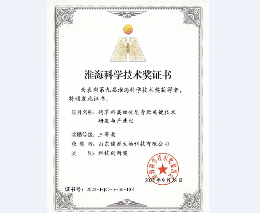 近日,第九屆淮海科學技術獎獲獎名單揭曉,經淮海科學技術獎獎勵評審委員會審查、初評、復評、一等獎答辯等規定程序,山東健源生物科技有限公司《飼草料高效優質青貯關鍵技術研發與產業化》項目榮獲淮海科學技術獎科技創新獎三等獎。淮海科技技術獎(國科獎社證字第0148號)是區域性科技獎勵與科技創新的高端平臺、是國家科技獎勵體系的重要組成部分,是經國家科技部、國家科學技術獎勵工作辦公室批準設立,是全國性社會力量科學技術獎。