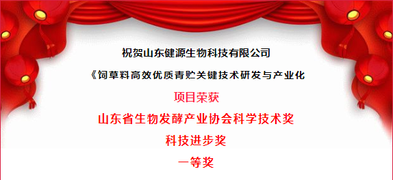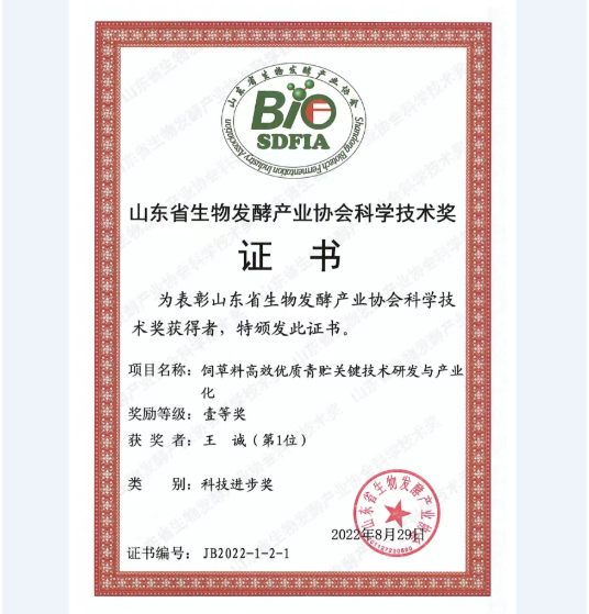 根據《國務院辦公廳關于完善科技成果評價機制的指導意見》(國辦發(2021)26 號)和《山東省科技廳關于進一步鼓勵和規范山東省社會力量獎設立科學技術獎的指導意見》(魯科字[2018]129號)精神,按照《山東省生物發酵產業協會科學技術獎獎勵章程》相關規定,開展了 2022 年度山東省生物發酵產業協會科學技術獎的申報、評審工作,經山東省生物發酵產業協會科學技術獎勵委員會評審和審核,山東省生物發酵產業協會批準,授予2項成果為科技進步獎一等獎,4項成果為科技進步獎二等獎,5項成果為科技進步獎三等獎。山東健源生物科技有限公司《飼草料高效優質青貯關鍵技術研發與產業化》項目榮獲山東省生物發酵產業協會科學技術獎科技進步獎一等獎。