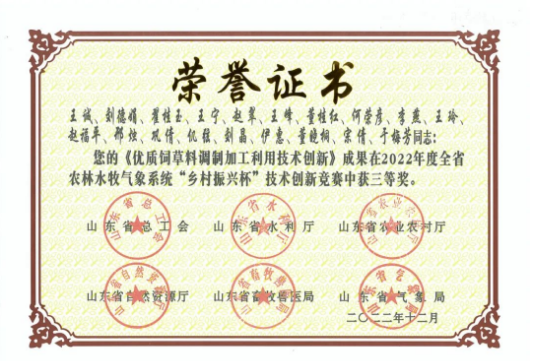 近日,由山東省總工會牽頭,山東省水利廳、山東省農業農村廳、山東省自然資源廳、山東省畜牧獸醫局、山東省氣象局組織的2022 年度全省農林水牧氣象系統 “鄉村振興杯”和“建設綠色安瀾黃河” 工作創新技術創新競賽獲獎成果進行了公布。山東健源生物科技有限公司《優質飼草料調制加工利用技術創新》成果榮獲2022年度全省農林水牧氣象系統“鄉村振興杯”技術創新競賽三等獎。