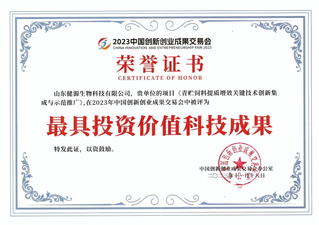 山東健源生物科技有限公司的《青貯飼料提質增效關鍵技術創新集成與示范推廣》項目在2023年中國創新創業成果交易會中被評為最具投資價值科技成果,該獎項的獲得充分肯定了健源生物在技術創新方面的卓越表現以及公司科技成果在市場應用方面的優秀潛力。