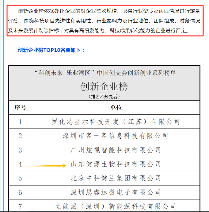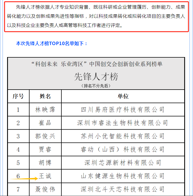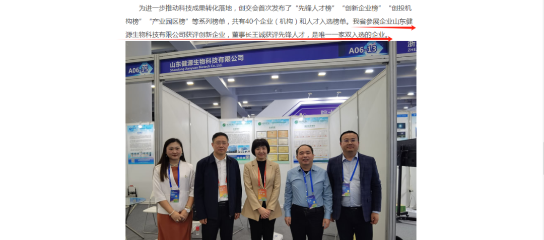 2023中國創新創業成果交易會于11月17日至19日在廣州舉辦。山東健源生物科技有限公司入選創新企業榜TOP10,董事長王誠入選先鋒人才榜TOP10,是山東省參展企業中唯一一家雙入選企業。