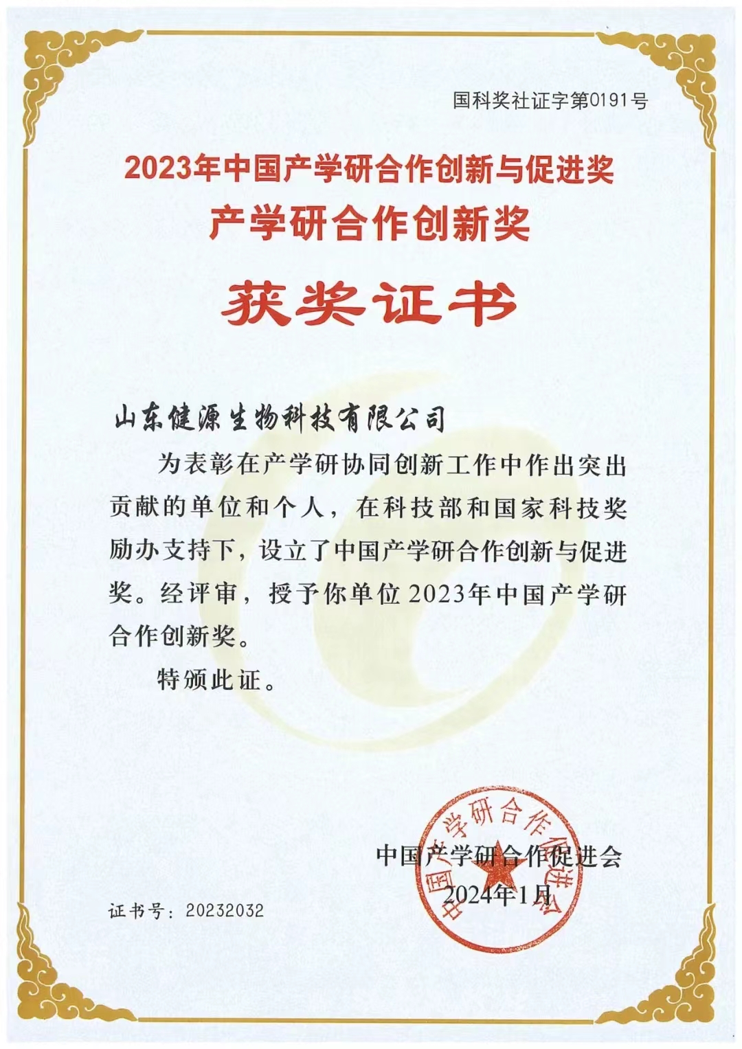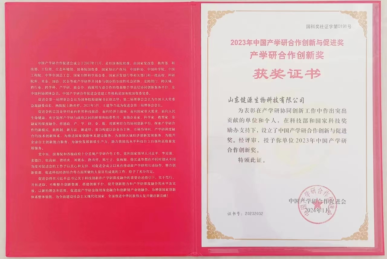大會表彰了2023年在產學研協同創新工作中做出突出貢獻的單位和個人。山東健源生物科技有限公司被中國產學研合作促進會授予2023年中國產學研合作創新獎。